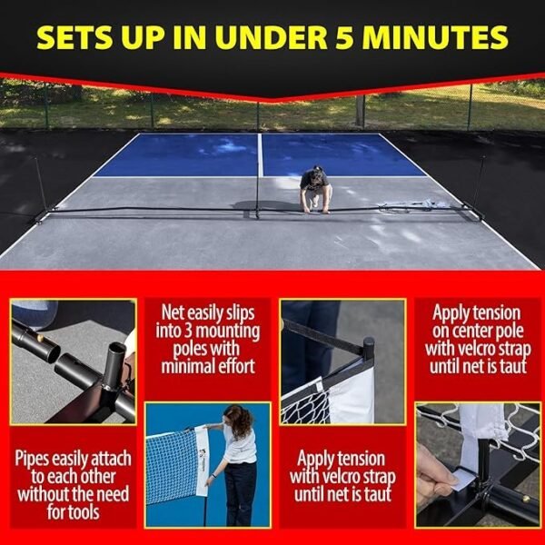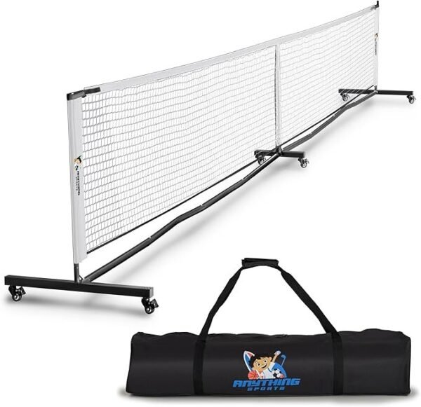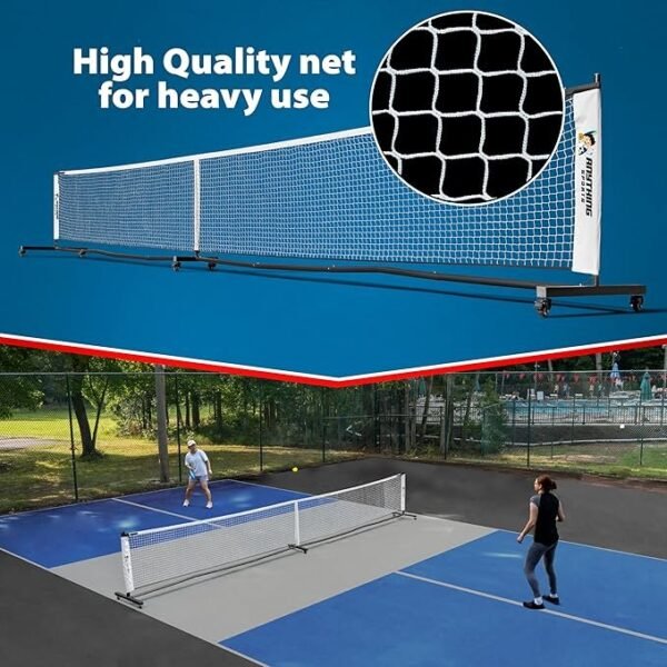 The net system includes easy-to-maneuver wheels, allowing for effortless portability between courts or storage. The adjustable tension system ensures a taut and consistent net for every game, providing optimal performance. Whether you’re playing indoors or outdoors, this high-quality net is designed to last and stand up to the elements.