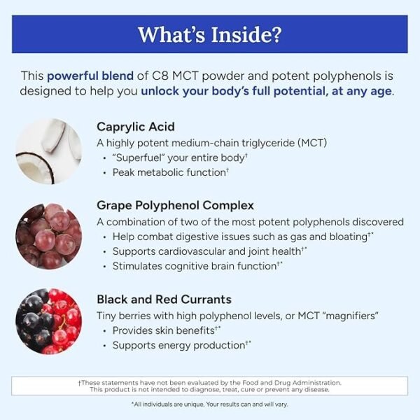 Support Metabolic Function: The MCT Wellness Powder contains C8 MCT oil, which is easily converted into ketones by your body. When your body switches from glucose to ketones as fuel, it enters a state of ketosis, helping support your metabolism and energy levels.