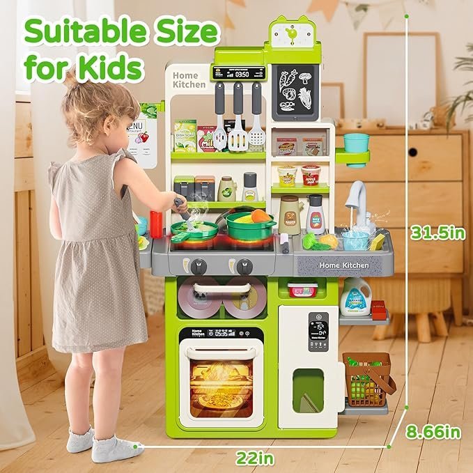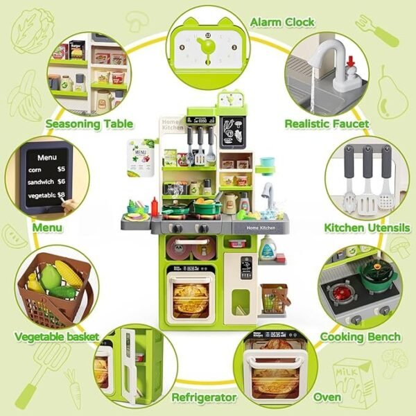 * Realistic Design: Includes a cooking stove with lights and sounds, a sink, and a range of play food and kitchen accessories, providing an authentic cooking experience.