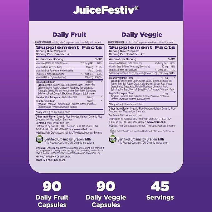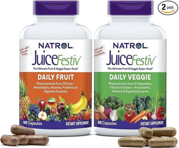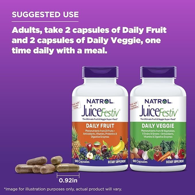Convenient Nutritional Support: Contains two 90-count bottles of Natrol JuiceFestiv Daily Fruit and Veggie Capsules for a 45-day supply, making it easy to incorporate essential fruits and vegetables into your diet.