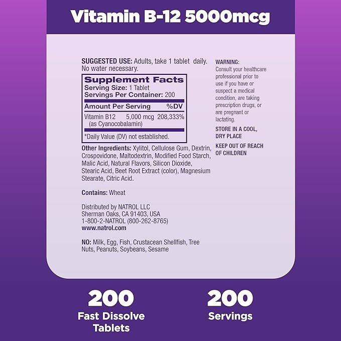 Natrol Vitamin B12 5,000 mcg, Fast Dissolve Supplement for Energy & Nervous System Support, 200 Tablets, 200 Day Supply