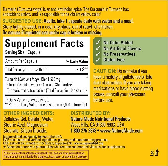 Nature Made Turmeric Curcumin 500 mg Capsules offer antioxidant support to help neutralize free radicals in the body. This herbal supplement contains 500 mg of Turmeric Curcumin per capsule, providing antioxidant benefits to help promote overall health. Made with high-quality ingredients, these capsules are gluten-free and contain no artificial flavors, colors, or preservatives. Turmeric, an Indian spice with a long history of traditional use, provides its vibrant yellow color from Curcumin, a powerful compound known for its antioxidant properties. Each bottle contains a 120-day supply, with adults recommended to take one capsule daily with water and a meal. Nature Made ensures quality you can trust, with ingredients, potency, and manufacturing processes verified by the United States Pharmacopeia (USP). These statements have not been evaluated by the Food and Drug Administration; this product is not intended to diagnose, treat, cure, or prevent any disease.