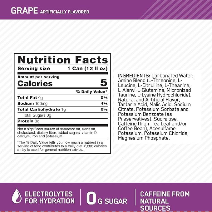 Revitalize your day with the Optimum Nutrition Amino Energy Sparkling Hydration Drink in a refreshing grape flavor. Packed with electrolytes, amino acids, and natural caffeine, this beverage supports hydration, energy, and muscle recovery—all in one can. Featuring a sugar-free formula and BCAAs for optimal performance, this drink is the perfect companion for workouts, busy days, or whenever you need a boost.