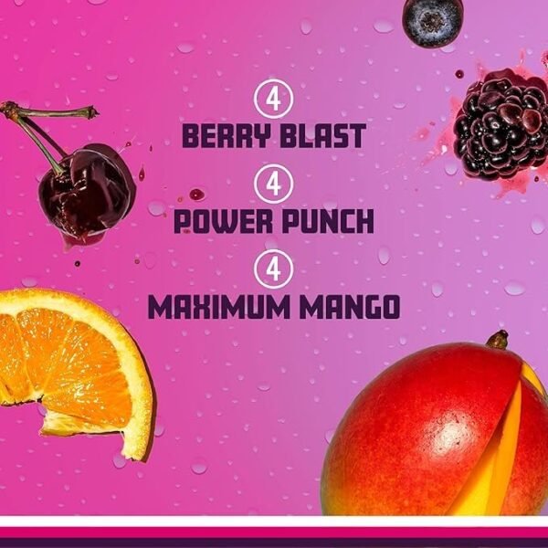* Variety of Flavors: Includes three distinct flavors—Berry Blast, Maximum Mango, and Power Punch—to suit diverse taste preferences.