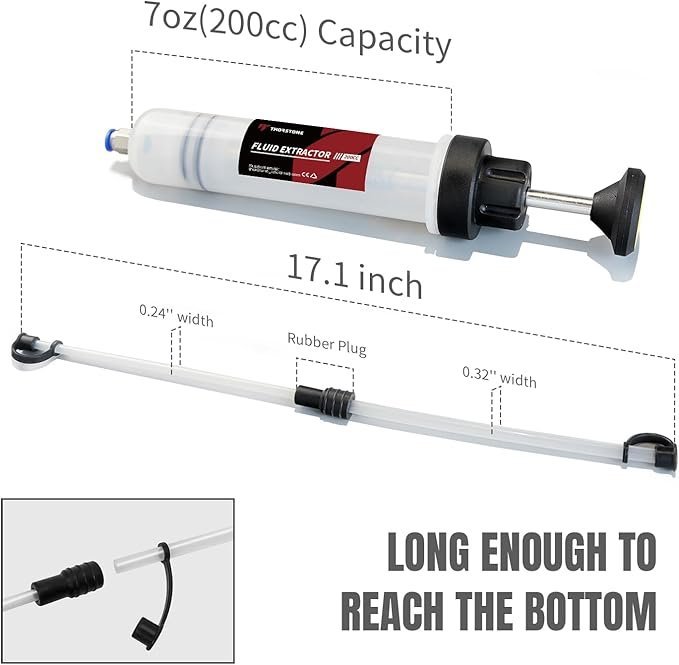 EFFORTLESS FLUID TRANSFER – Thorstone syringe-style fluid evacuator features extension tubes with 0.24″ OD and 0.32″ OD, reaching up to 40 cm when connected. Ideal for extracting and replacing transmission fluid, power steering fluid, gear oil, antifreeze, brake fluid, and more, even in hard-to-reach areas.