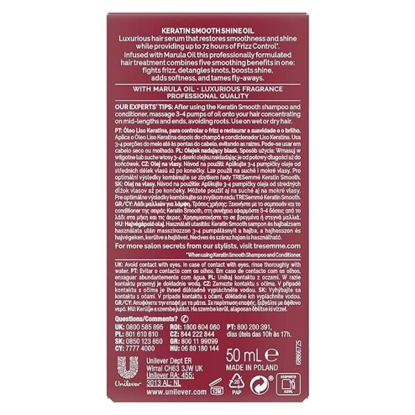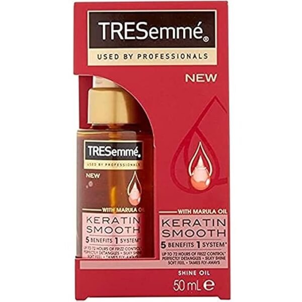Achieve professional-level smoothness and shine with TRESemmé Pro Collection Keratin Smooth Shine Oil, a salon-quality treatment that transforms your hair. This luxurious formula is infused with Marula Oil, known for its nourishing properties, and is designed to provide intense hydration while giving your hair a sleek, shiny finish. Perfect for all hair types, the Keratin Smooth Shine Oil works to eliminate frizz, control flyaways, and smooth your hair without weighing it down. Whether you’re dealing with humid conditions or simply want to maintain a polished, glossy look, this oil will leave your hair feeling soft, hydrated, and glossy all day long.
