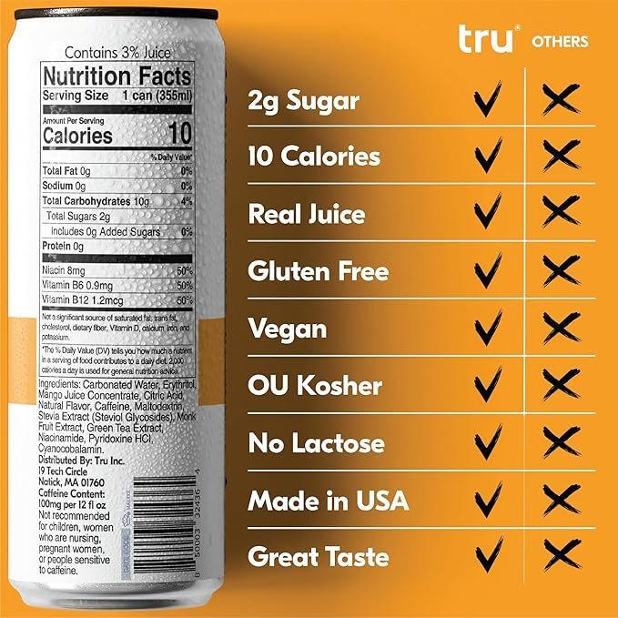Tru Energy Seltzer is a refreshing, caffeine-free sparkling water infused with B-vitamins and natural fruit flavors. Each 12 fl oz can delivers a crisp mango flavor, providing a delightful alternative to traditional sugary beverages. This beverage is gluten-free, kosher, and contains no added sugars, making it a health-conscious choice for those seeking a flavorful, low-calorie drink. The 12-pack ensures you have a ready supply of this energy-boosting beverage.